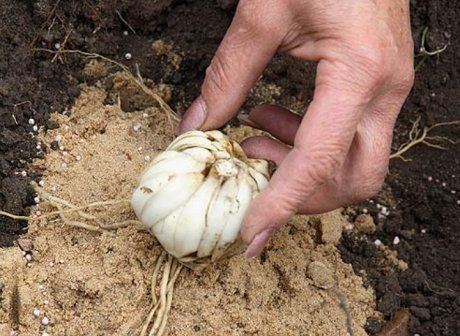 Посадіть цибулини лілій у лунки глибиною 10-15 см та на відстані біля 15 см одна від одної.